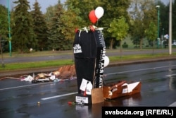 Вот такие послания и "подарки" участники марша в Минске оставили рядом с Дворцом Независимости, когда дорогу им преградил ОМОН. Среди них был гроб с надписью "Диктатор – политический труп", а также траурные венки.